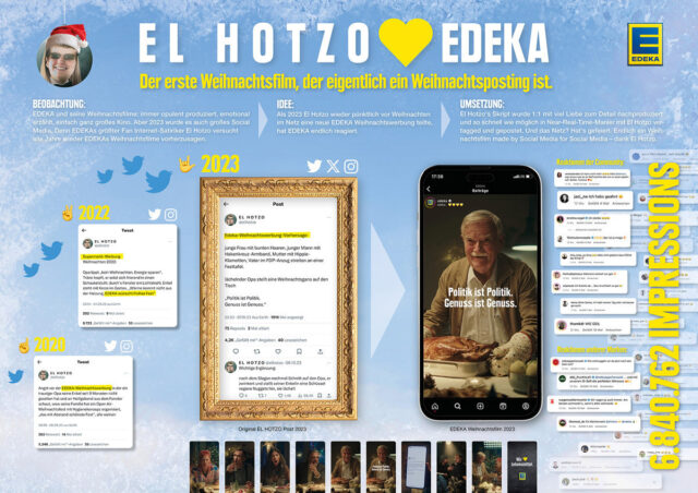 EDEKA und seine Weihnachtsfilme: immer opulent produziert, emotional erzählt, einfach ganz großes Kino. Aber 2023 wurde es auch großes Social Media. Denn EDEKAs größter Fan Internet-Satiriker El Hotzo versucht alle Jahre wieder EDEKAs Weihnachtsfilme vorherzusagen. Als 2023 El Hotzo wieder pünktlich vor Weihnachten im Netz eine neue EDEKA Weihnachtswerbung teilte, hat EDEKA endlich reagiert. El Hotzo's Skript wurde 1:1 mit viel Liebe zum Detail nachproduziert und so schnell wie möglich in Near-Real-Time-Manier mit El Hotzo vertagged und gepostet. Und das Netz? Hat's gefeiert. Endlich ein Weihnachtsfilm made by Social Media for Social Media – dank El Hotzo.