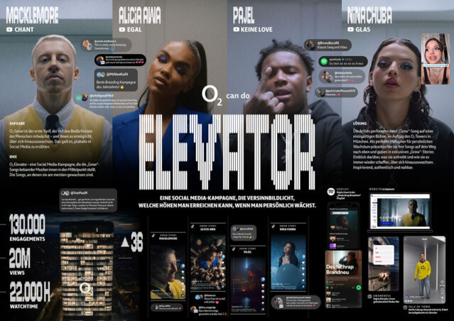 Die Lösung: O2 Elevator – eine Social Media-Kampagne, die die Grow-Songs bekannter Musiker:innen in den Mittelpunkt stellt. Die Songs, an denen sie am meisten gewachsen sind – verbunden mit den ganz persönlichen Grow-Geschichten dahinter.