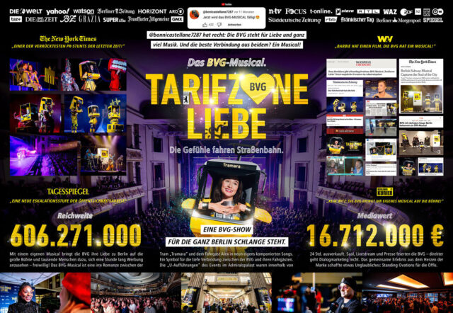 „Tarifzone Liebe“ feiert die tiefe Verbindung zwischen der BVG und ihren Fahrgästen und kommt so – anders als andere Brand-Musicals – direkt aus dem Herzen der Marke.