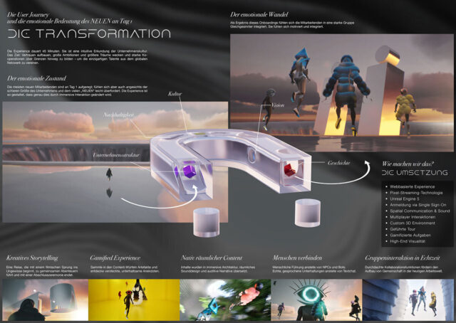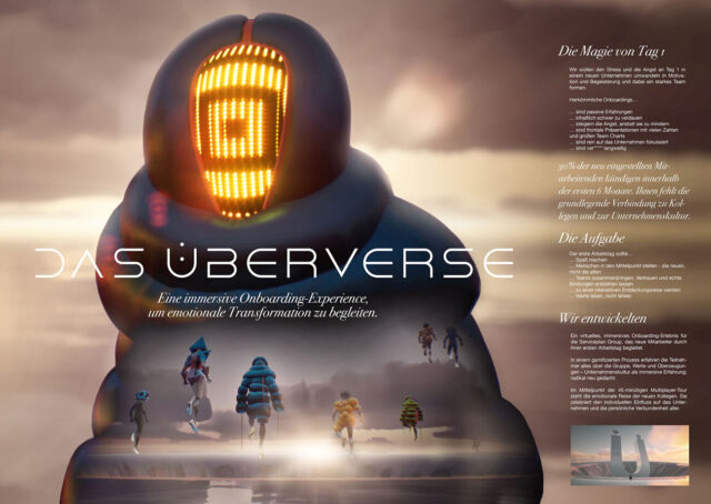 Passives Marken-Onboarding von Mitarbeitenden wird zu einem aktiven Erlebnis: Unternehmenswerte leben statt lehren. Wir kreieren eine immersive, interaktive Erfahrung, die durch Storytelling in Echtzeit sowohl Gemeinschaft als auch Vertrauen fördert. Ein Erlebnis, das die Serviceplan-CI mit ihrer Arbeitsphilosophie „ÜberCreativity“ in eine individuelle 3-D-Welt verwandelt. Denn: Das Unterbewusstsein nimmt diese Markenwerte viel effektiver auf als traditionelles Onboarding.
