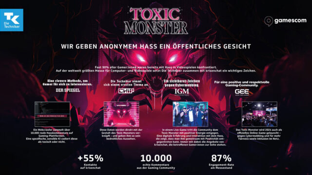 Ein Webcrawler geht vor der gamescom bei Gaming-Formaten auf die Jagd nach Hassbotschaften. Über 10.000 Kommentare werden durch eine sensible, spezifische KI erfasst und als toxisch oder nicht codiert. Diese Daten werden direkt mit der Gestalt des Toxic Monsters verknüpft und geben ihm sein bedrohliches Aussehen. Je mehr Hass identifiziert wird, desto größer wächst das Monster. So sensibilisieren wir visuell-emotional dafür, wie groß die Menge an Hate-Speech auf den Plattformen ist – und wie bedrohlich sie für die oft junge Community ist.